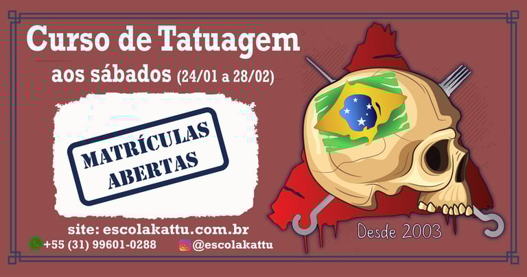 Curso Mensal. Inicia dia 24 de janeiro de 2026 e termina dia 28 de fevereiro de 2026, com aulas todos os sábados voltados para a formação teórico-técnica do aluno, visando desenvolver um profissional qualificado para o mercado de trabalho. Dentre as disciplinas estão: Biosseguranca, Desenho Técnico, Administração de Estudios, Desenho para Tatuagem, Regulagem de Máquinas, Tipos de Agulhas para tatuagem, Marketing, História da Tatuagem, Preparação para a Prática, Tintas e Colorimetria. Teremos a correção de exercícios e avaliação, bem como, teremos os treinamentos práticos em pele artificial, desenvolvendo o aprendizado teórico nas técnicas de: Fineline, Boldline, Sculptline, Traço invisível, Cores sólidas, Rastelado, Pontilhismo, Sombreado e Fusão de cores. No último dia, haverá uma confraternização e entrega de certificados.
